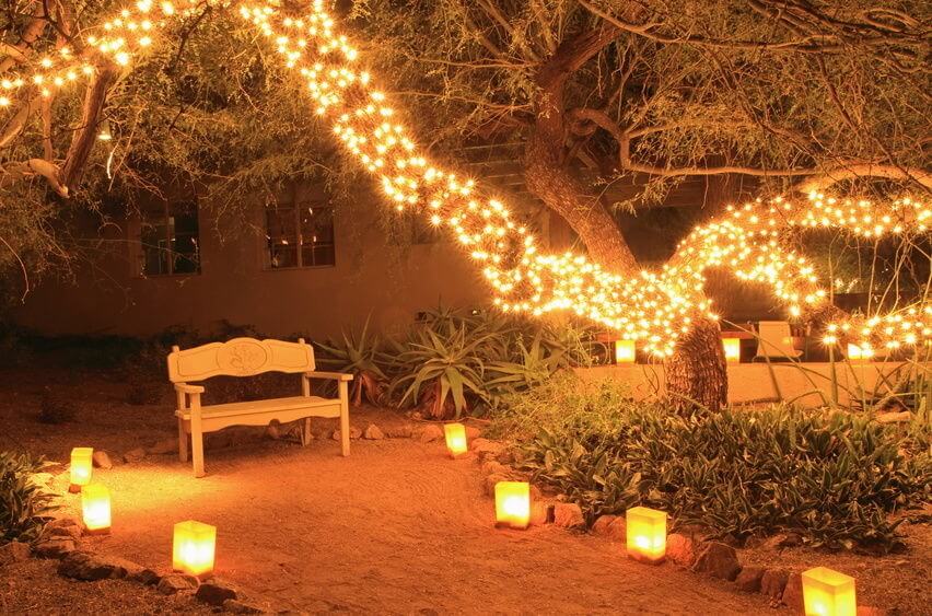 If the outdoor space has trees or tall bushes in its landscape, light it up with string lights or these 5mm warm white lights. It’s a beautiful effect, as the lights work their way up into the treetops and as your residents walk along, new lights pop up and others get obscured by the surrounding leaves. This beautiful light beckons you to come outside, which will further strengthen that sense of community that your residents are craving. Connect them to a timer and set from dusk to dawn.