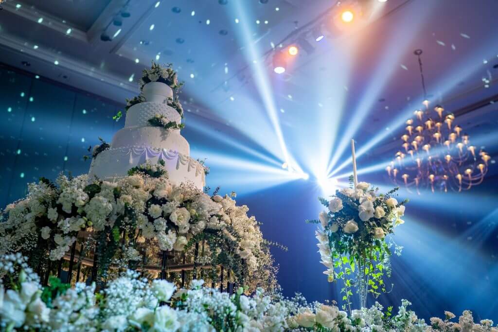 Focusing on one area of the room to showcase your lighting on will help draw the guests’ eyes to one central location. Choosing a strategic focal point, such as the wedding cake, the head table at a wedding, or a product display at a corporate event, makes it easier to focus your budget and resources into a small area, while still wowing the attendees.
