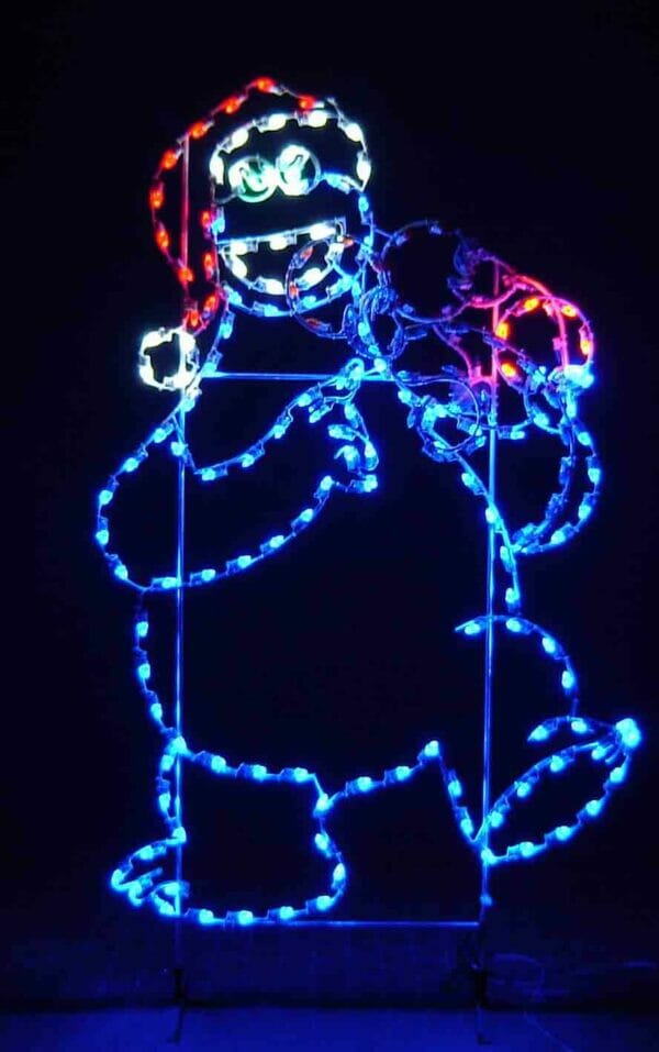 This 8′ Ground Mounted Silhouette Animated Cookie Monster with Santa Hat throwing a cookie into his mouth Christmas decoration is made with a heavy-duty steel rod construction, along with a corrosion-resistant powder coating. Commercial grade wiring is then applied, which is secured by our heavy-duty clips and nylon ties.