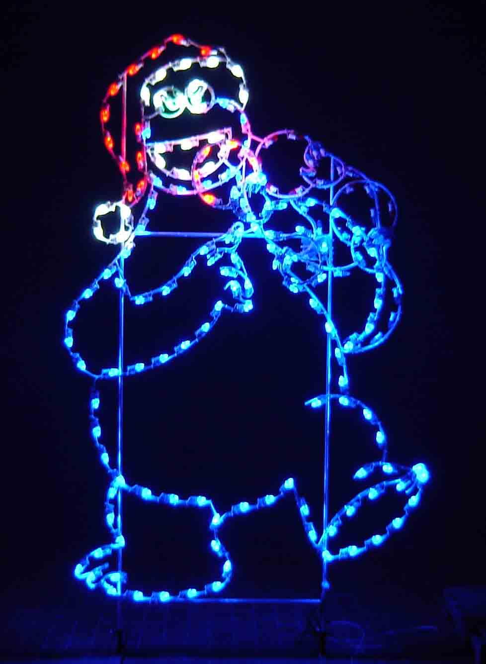 This 8′ Ground Mounted Silhouette Animated Cookie Monster with Santa Hat throwing a cookie into his mouth Christmas decoration is made with a heavy-duty steel rod construction, along with a corrosion-resistant powder coating. Commercial grade wiring is then applied, which is secured by our heavy-duty clips and nylon ties.