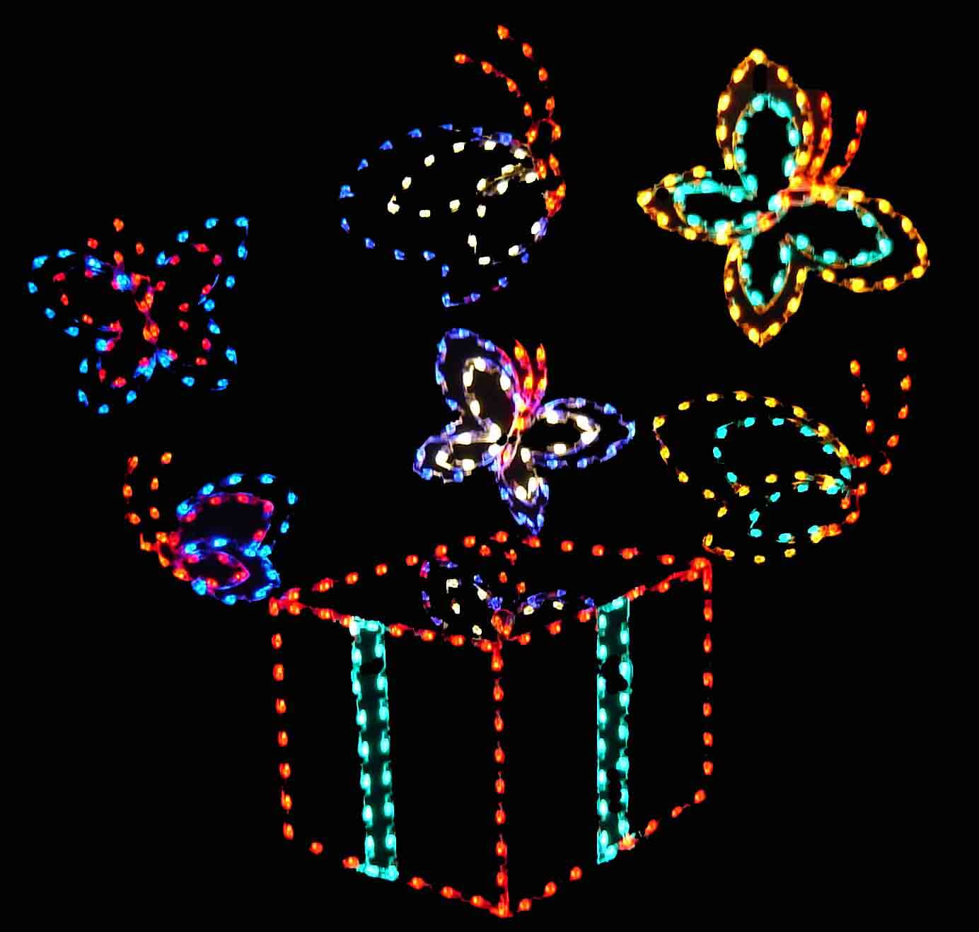 This 10′ X 10′ Ground Mounted Silhouette Animated Butterfly Box decoration is made with a heavy-duty steel rod construction, along with a corrosion-resistant powder coating. Commercial grade wiring is then applied, which is secured by our heavy-duty clips and nylon ties.