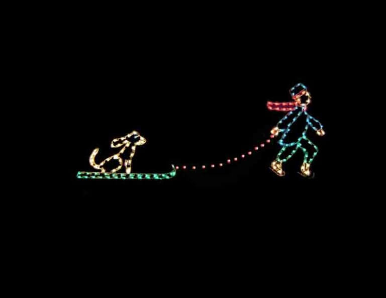This 5′ x 9′ Ground Mounted Silhouette Boy Pulling Dog on Sled Christmas decoration is made with a heavy-duty steel rod construction, along with a corrosion-resistant powder coating. Commercial grade wiring is then applied, which is secured by our heavy-duty clips and nylon ties.