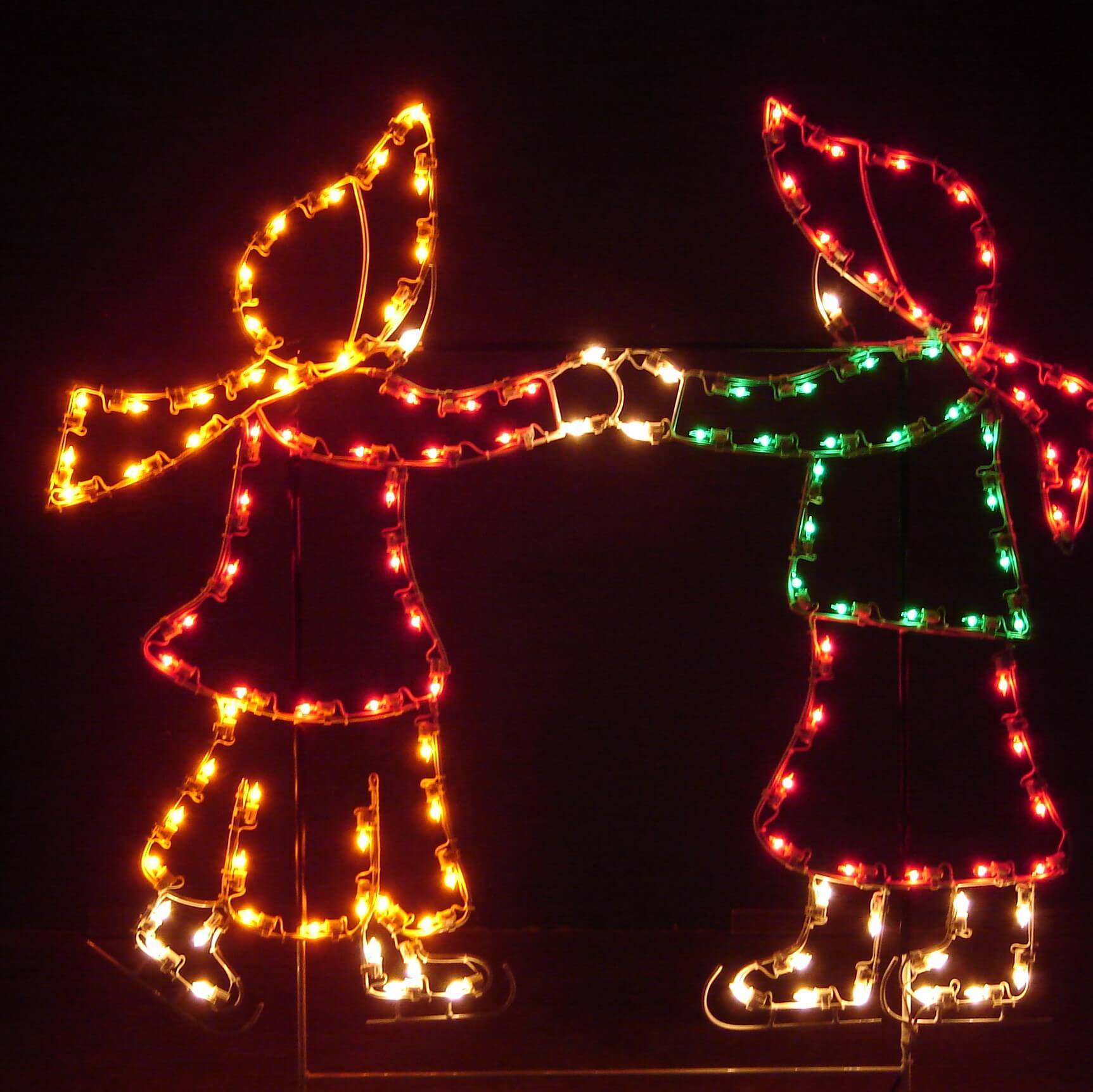 This 5′ Tall X 6′ Wide Ground Mounted Silhouette Two Girls Skating Christmas decoration is made with a heavy-duty steel rod construction, along with a corrosion-resistant powder coating. Commercial grade wiring is then applied, which is secured by our heavy-duty clips and nylon ties.