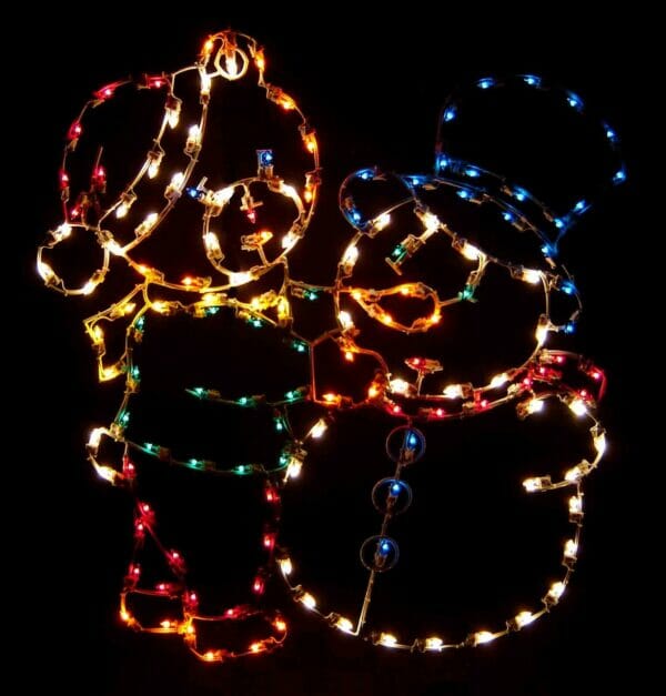 This 6-foot Ground Mounted Silhouette Snowman with Bear Christmas decoration is made with a heavy-duty steel rod construction, along with a corrosion-resistant powder coating. Commercial grade wiring is then applied, which is secured by our heavy-duty clips and nylon ties.