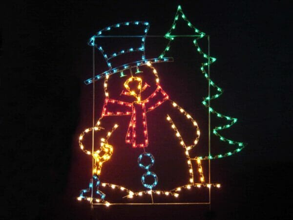 This 6-foot Ground Mounted Silhouette Snowman with Tree Christmas decoration is made with a heavy-duty steel rod construction, along with a corrosion-resistant powder coating. Commercial grade wiring is then applied, which is secured by our heavy-duty clips and nylon ties.