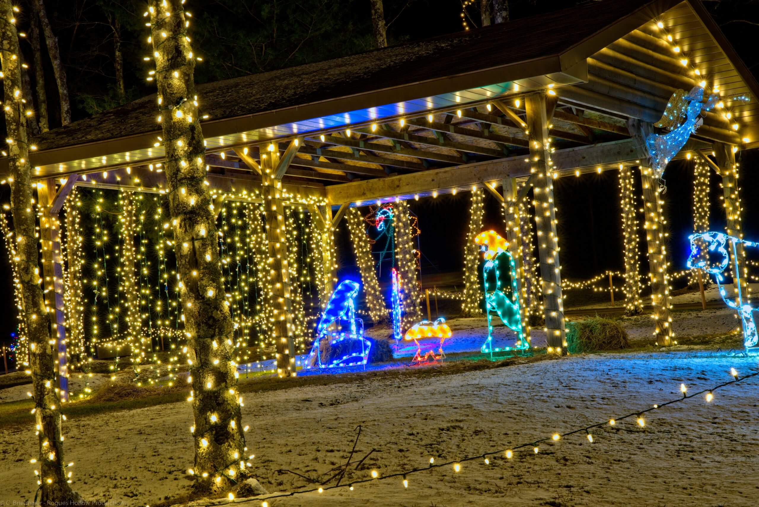 Pole-mounted light display figures include candy canes, doves, snowflakes, bells, angels, soldiers, Santa, and more.